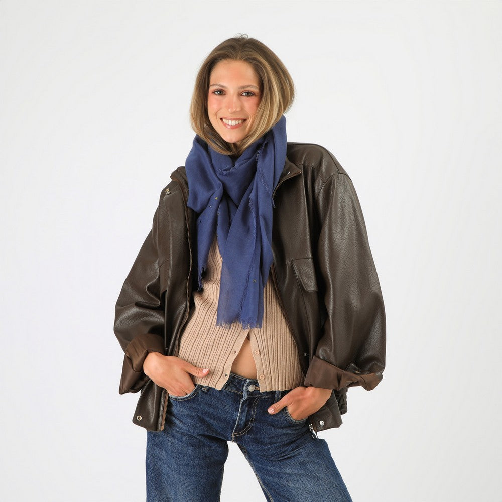 Pañuelo en color azul, confeccionado en textil liviano, con pequeños apliques sutiles distribuidos en el diseño. Cuenta con terminaciones desflecadas en los bordes. Un accesorio ideal para complementar distintos looks.