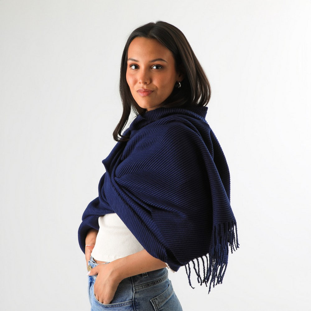 Pañuelo de color azul, confeccionado en tejido acanalado, con flecos en los bordes y etiqueta de la marca visible. Un accesorio práctico y fácil de combinar.