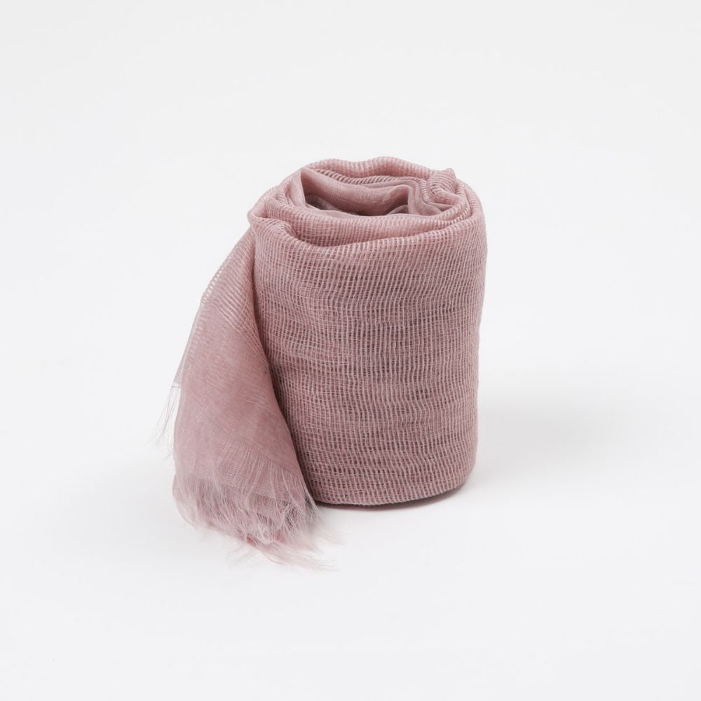 Pañuelo rosado semi transparente dividido en dos con una mitad tejida lisa y otra mitad con tejido de red con terminacioes desflecadas en los extremos del pañuelo.