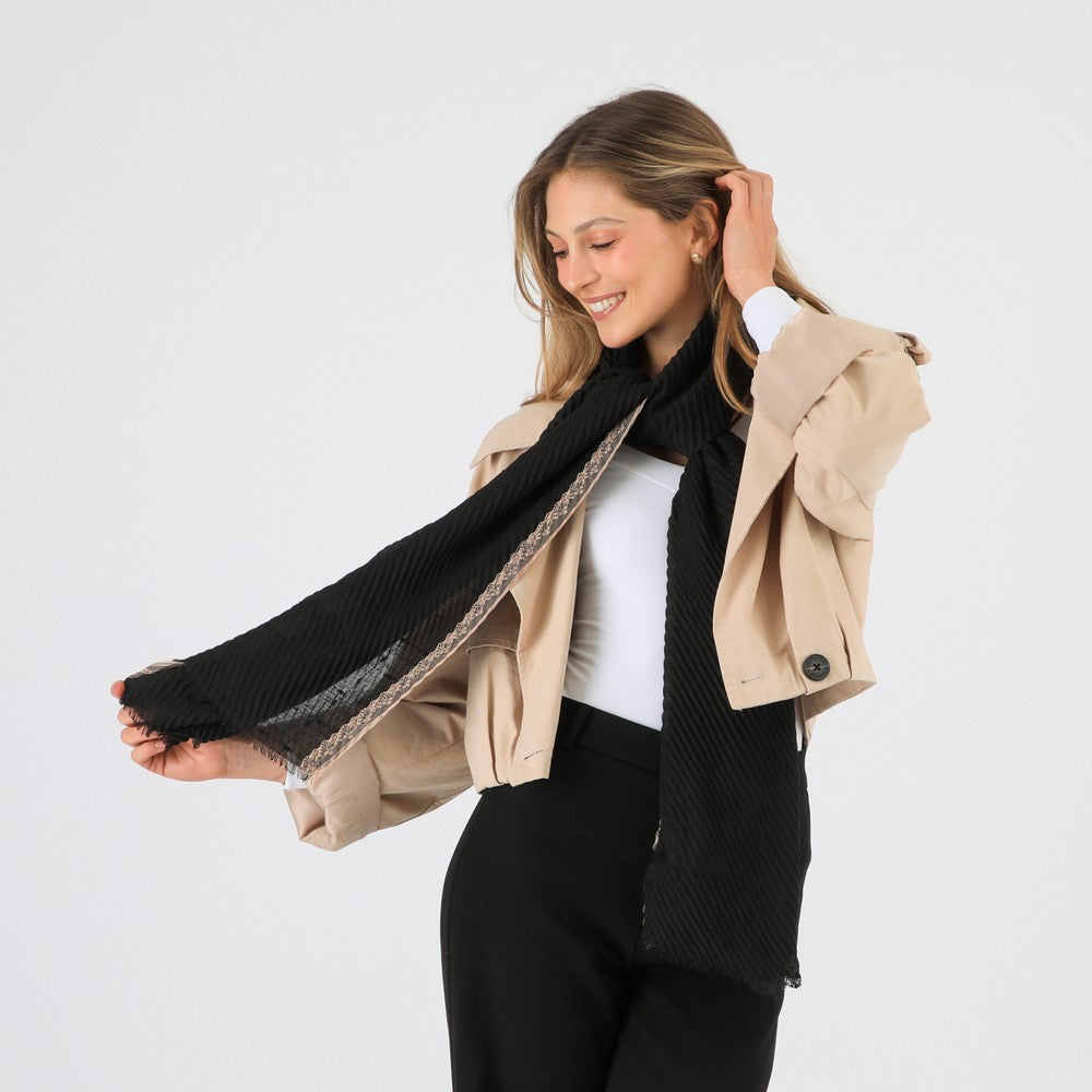 Pañuelo negro plisado, confeccionado en tela liviana y semitransparente, que genera una textura uniforme en toda la superficie. El borde inferior está terminado con encaje delicado en tono claro, aportando un detalle femenino y elegante. Un accesorio liviano, fácil de combinar y pensado para dar un toque sofisticado a looks diarios o de ocasión.