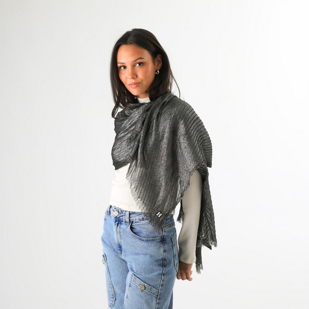 Pañuelo color negro, con hilos brillantes plateados integrados en la trama que aportan un leve efecto luminoso. Presenta bordes desflecados.