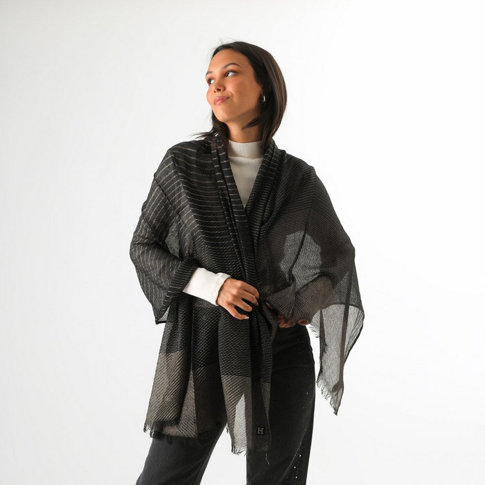 Pañuelo en tono oscuro con trama de hilos brillantes en color dorado, distribuidos sobre la superficie. Diseño liviano con terminación en flecos. Un accesorio versátil que aporta un toque sutil de brillo al look.