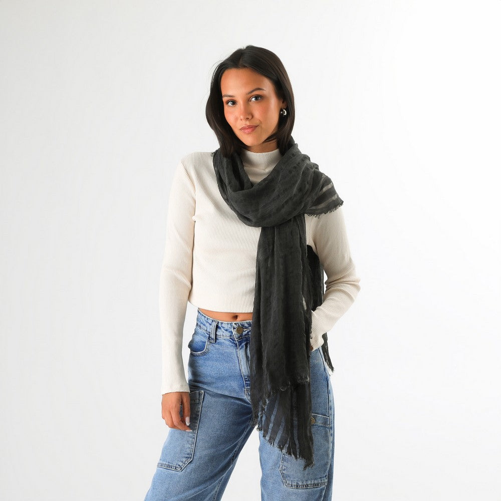 Pañuelo de color negro, teñido a mano, con líneas sutiles integradas al tejido. Presenta bordes desflecados. Un accesorio liviano y fácil de combinar.