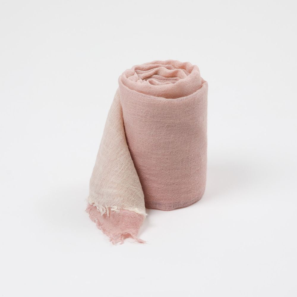 Pañuelo rosado con un decolorado desde el rosado hasta el crema con terminaciones desflecadas en los extremos más cortos del pañuelo.