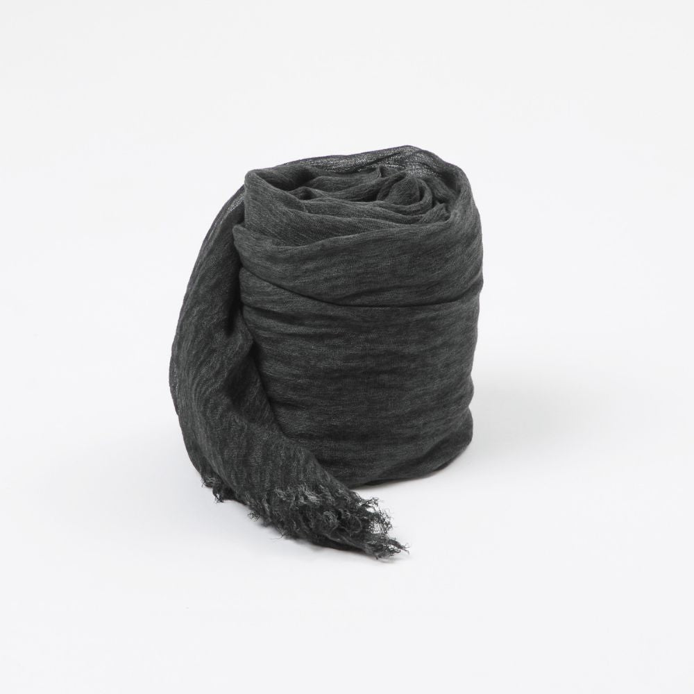 Pañuelo gris liso teñido a mano con acabados desteñidos con terminaciones desflecadas en los extremos más cortos del pañuelo.