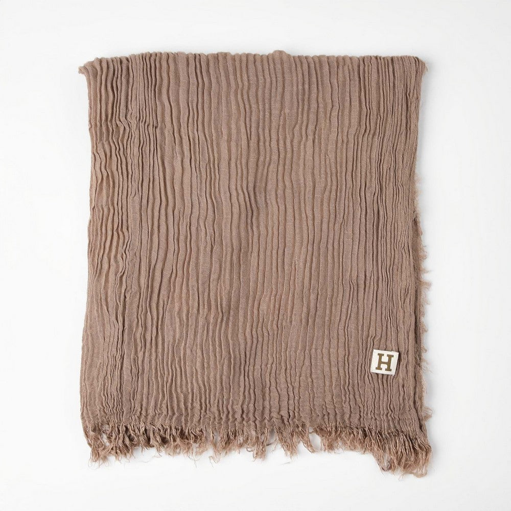 Pañuelo teñido a mano en tono beige oscuro, confeccionado en tela liviana con textura plisada y caída suave. Presenta flecos en los extremos que aportan movimiento y un acabado relajado. Un complemento fácil de combinar para sumar abrigo ligero.