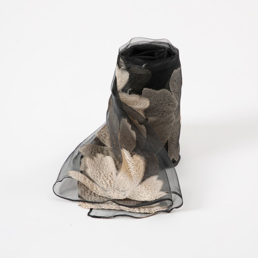Pañuelo de fiesta negro semi transparente con bordados florales en color beige con terminaciones en costura lisa.