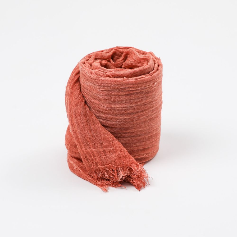 Pañuelo naranjo liso teñido a mano con acabado semi arrugado con hilos tejido que generan lineas paralelas con terminaciones desflecadas en los extremos del pañuelo.