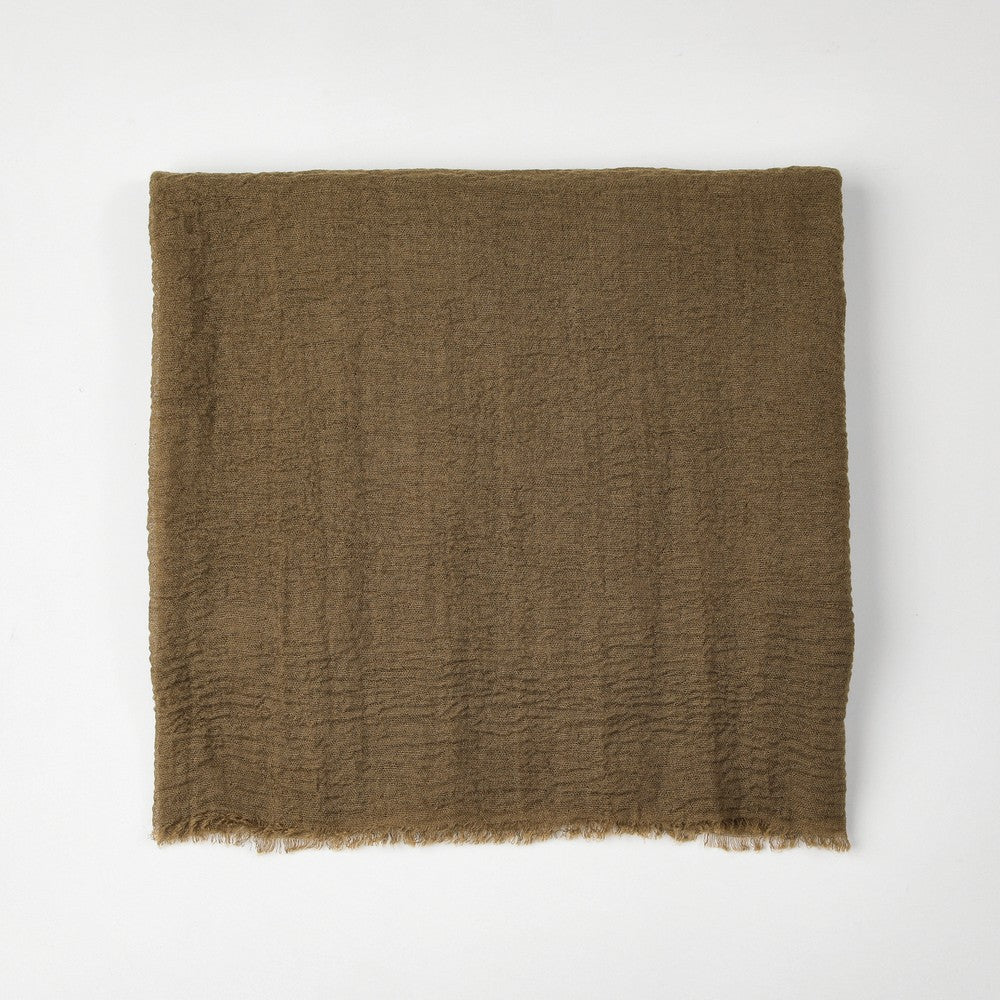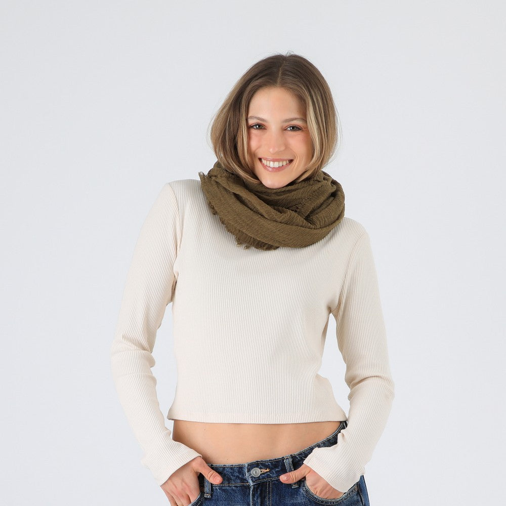 Pañuelo liso de diseño moderno, en color verde oliva, con terminaciones desflecadas que aportan textura y carácter. Ideal para complementar looks de invierno y sumar un toque a abrigos, chaquetas y outfits en capas.