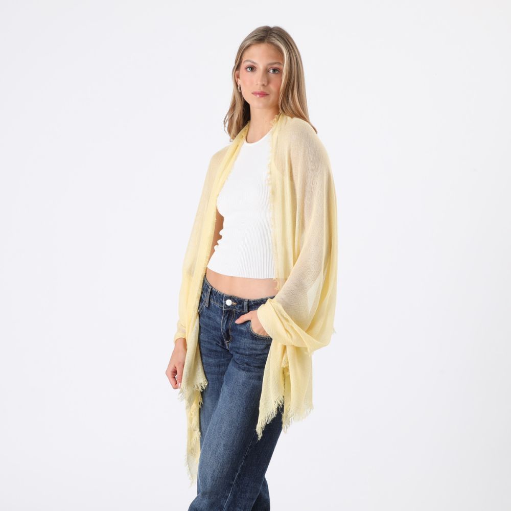 Pañuelo amarillo pastel micro tejido, textura suave y terminación en bordes con flecos. Teñido a mano.