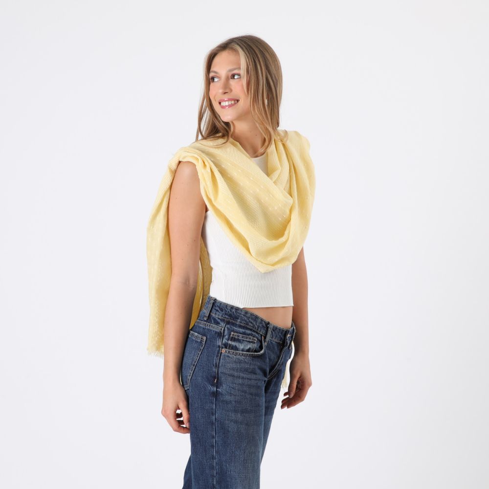 Pañuelo amarillo pastel con líneas blancas, textura suave y terminación en bordes con flecos. Teñido a mano.