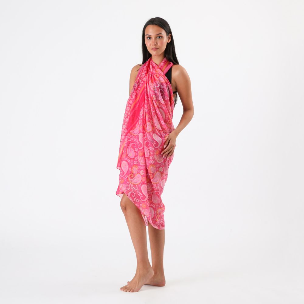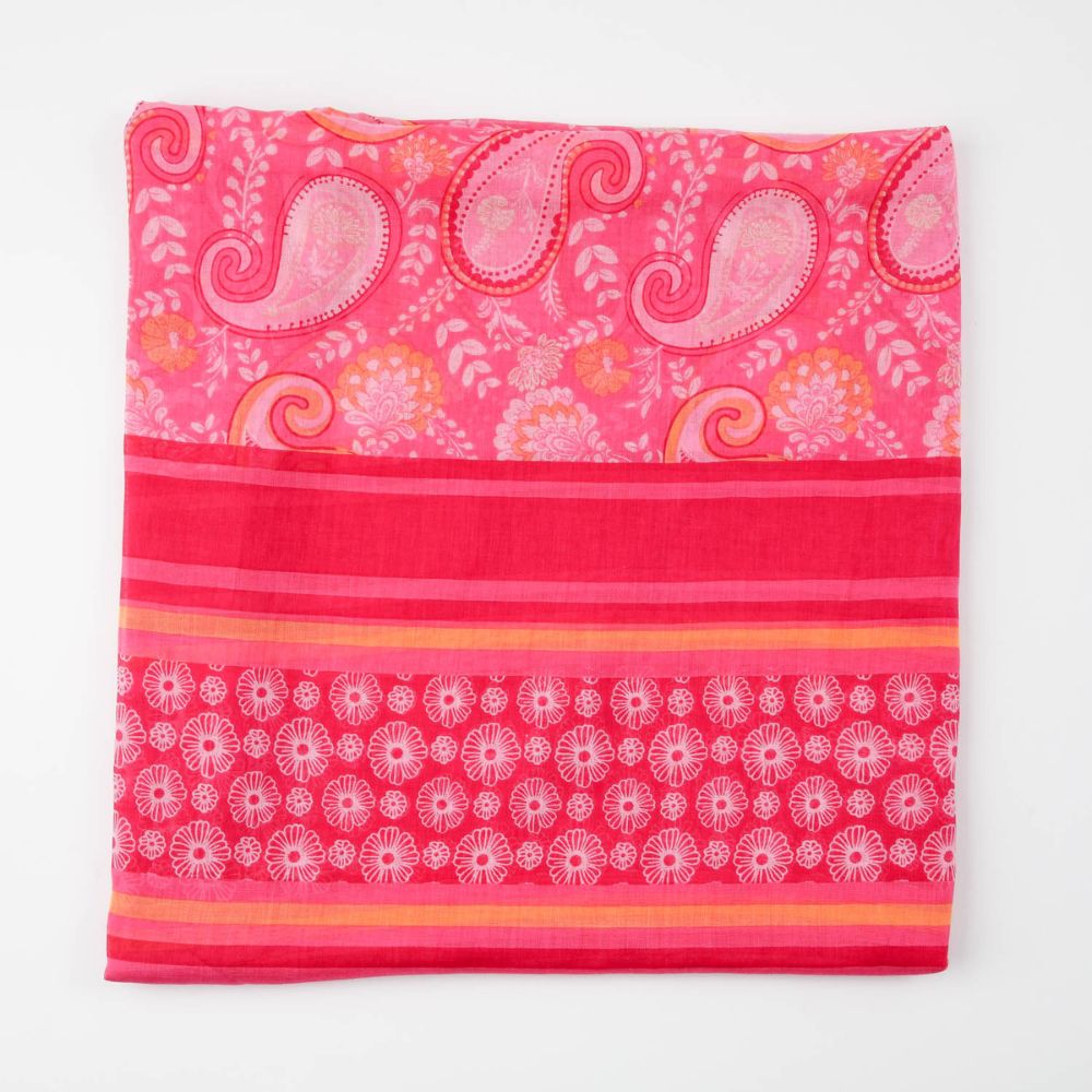 Pareo fucsia 100x180 cm con estampado de paisley floral y líneas. Terminación dobladillo.