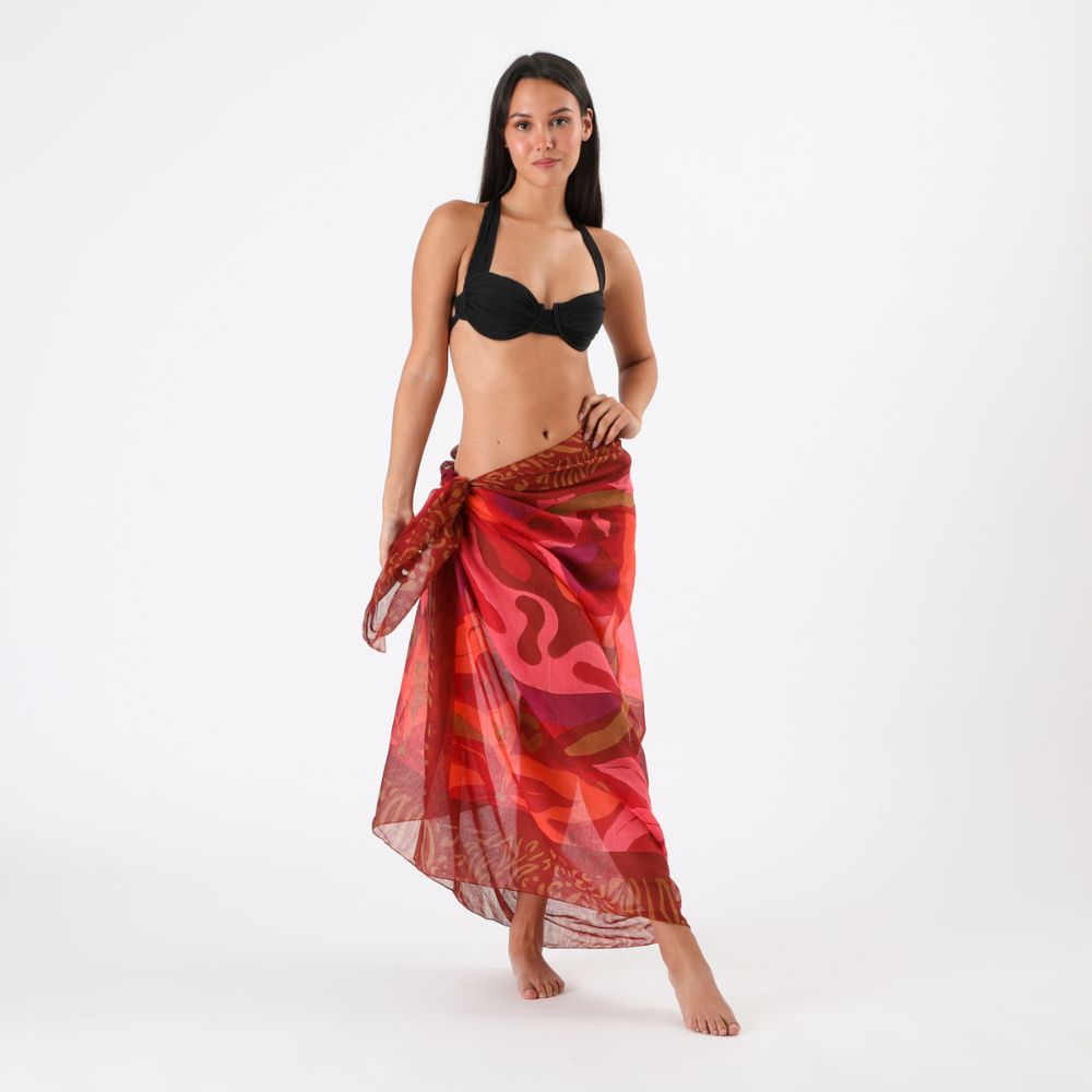 Pareo rojo 100x180 cm con estampado floral tropical multicolor, bordes con estampado animal print. Terminación dobladillo.