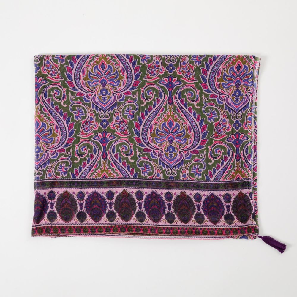 Pareo estampado con motivos paisley rosados, morados con detalles azules sobre un fondo verde musgo con terminaciones de borlas en las cuatro esquinas.