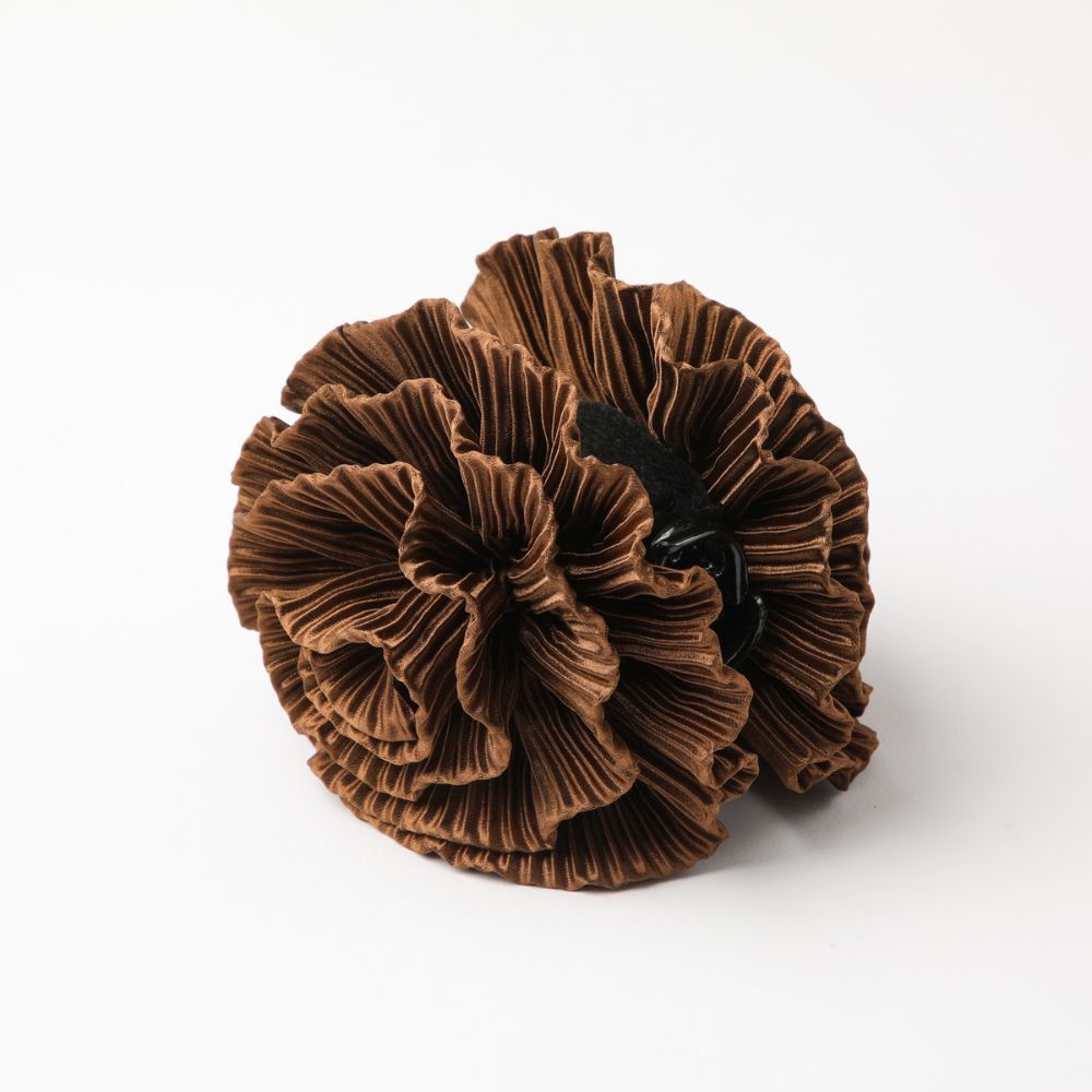 Pinche de flor mediana en tela plizada con capas de pétalos circulares y de color café.