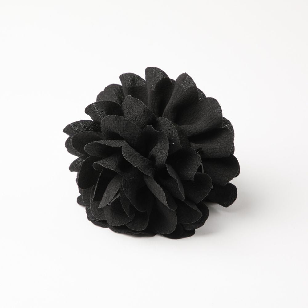 Pinche de flor mediana en tela con capas de pétalos y de negro.