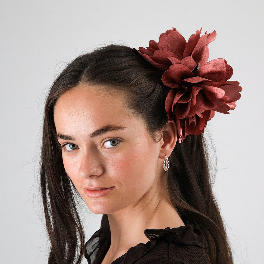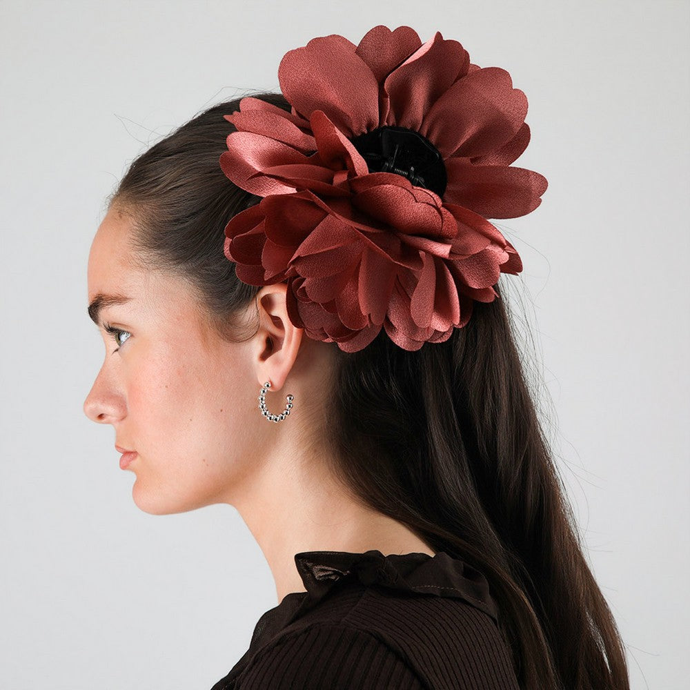 Accesorio para el pelo con diseño de flor en tono burdeo. Presenta pétalos superpuestos que aportan volumen y un acabado liviano. En la parte posterior incorpora pinza plástica, cómoda para recoger el cabello. Un accesorio femenino y fácil de combinar.
