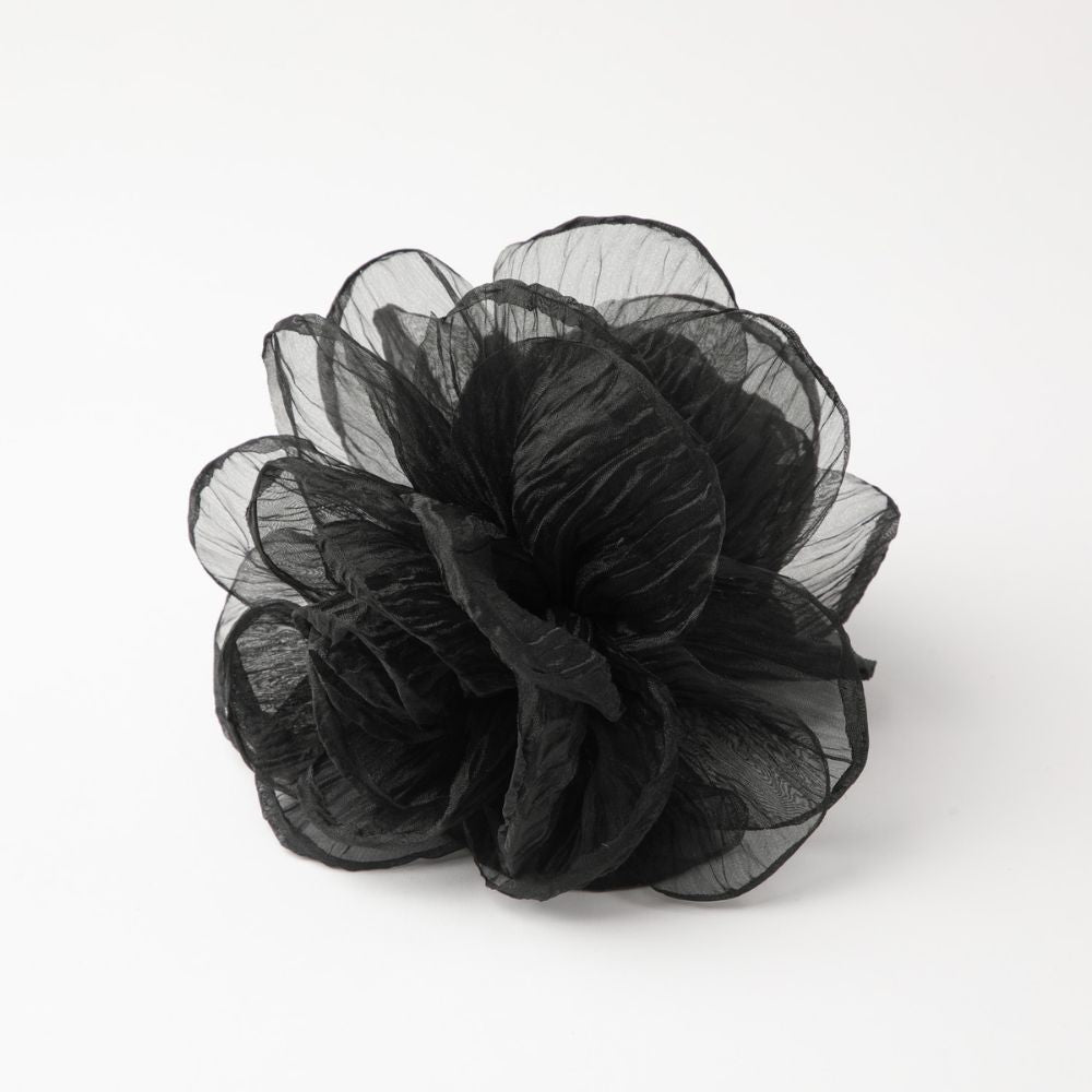 Pinche de flor grande en tela arrugada semitransparente con capas de pétalos y de color negro.