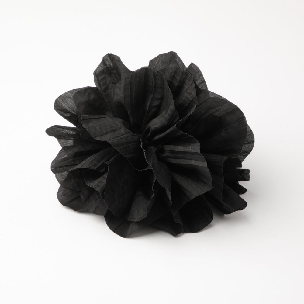 Pinche de flor grande en tela arrugada con capas de pétalos y de color negro.