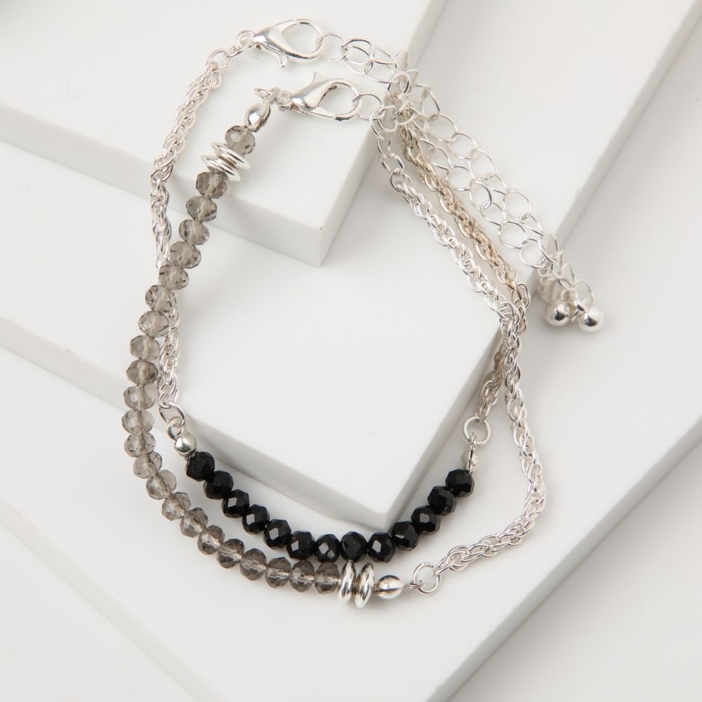 Pulsera de doble cadena plateada con partes en montacillas de tonos negro y gris.