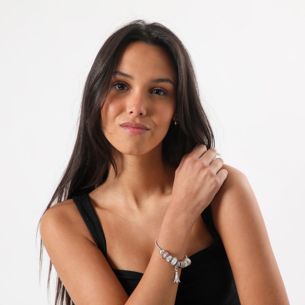 Pulsera de mostacillas esfericas en tonalidades rosadas y plateadas con dijes de elefante y torre eiffel.