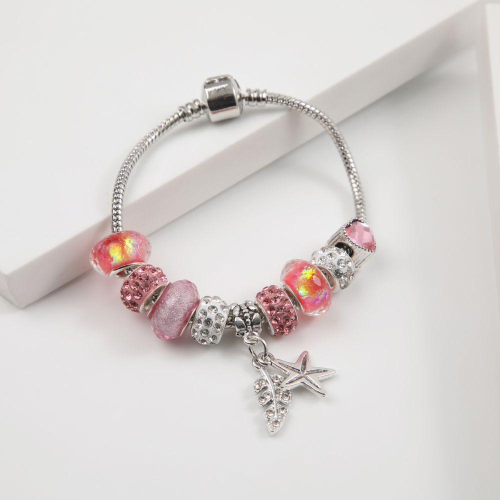 Pulsera de mostacillas esfericas en tonalidades rosadas, moradas y plateadas con dijes de estrella y pluma.