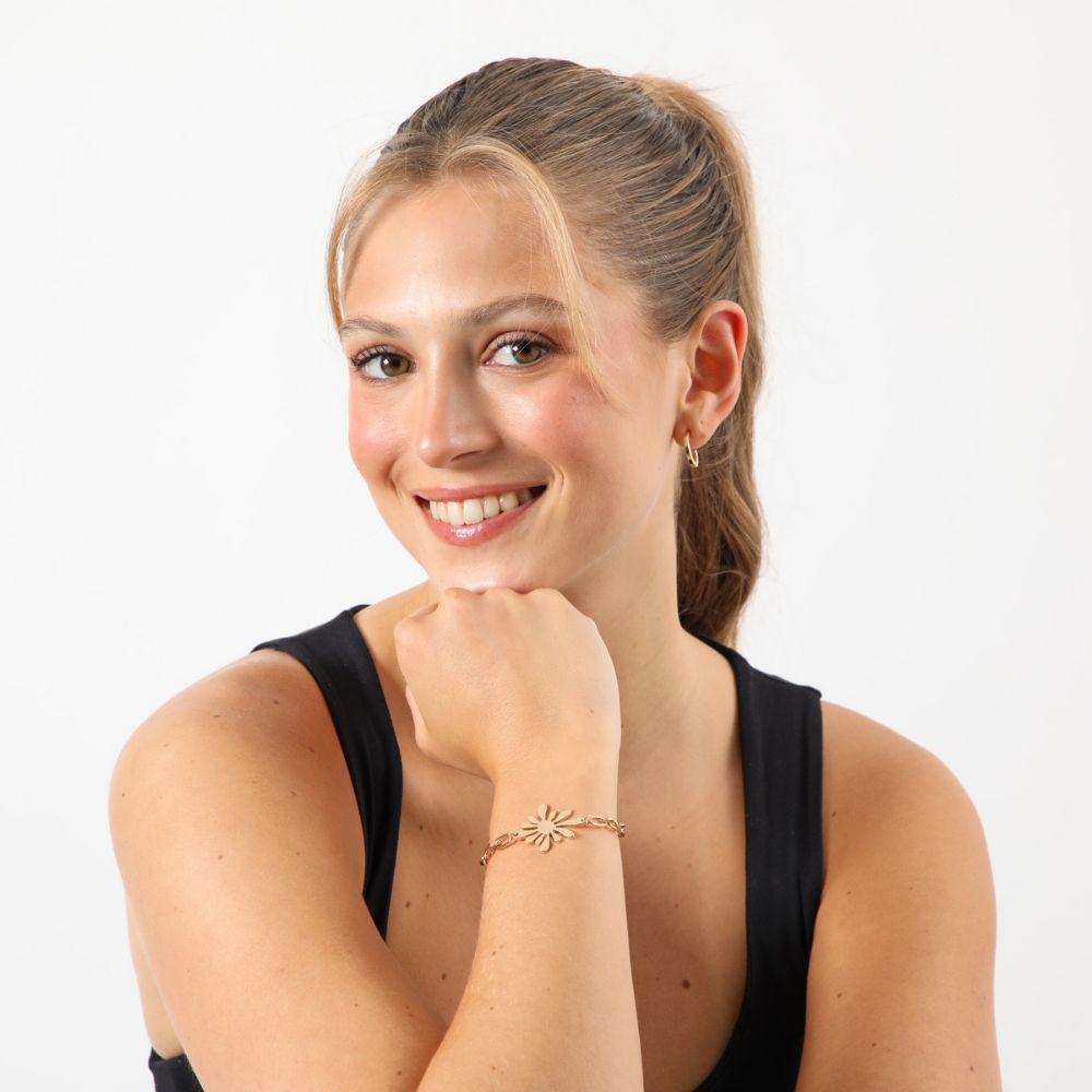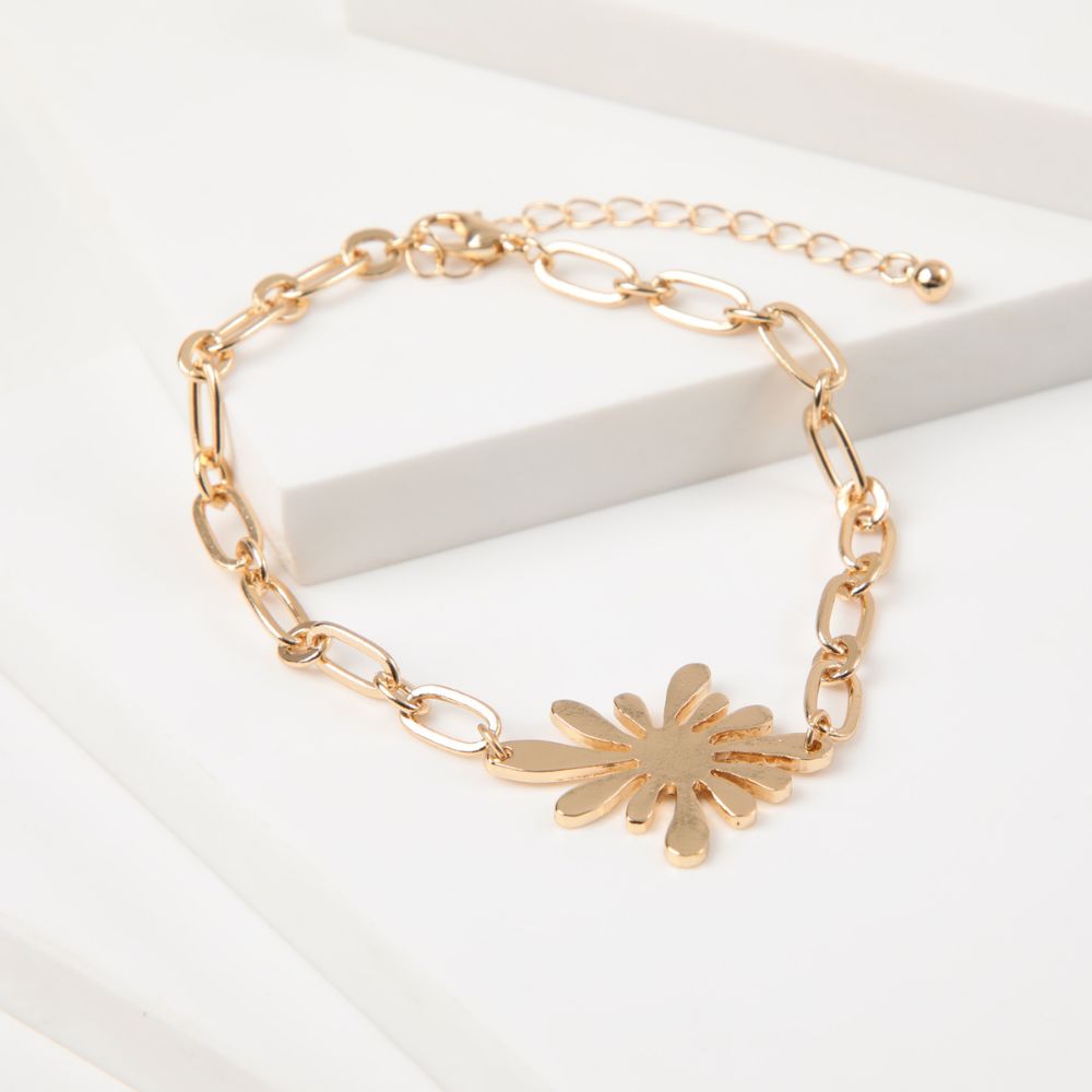 Pulsera dorada de eslabones gruesos con dije de flor abstracta.