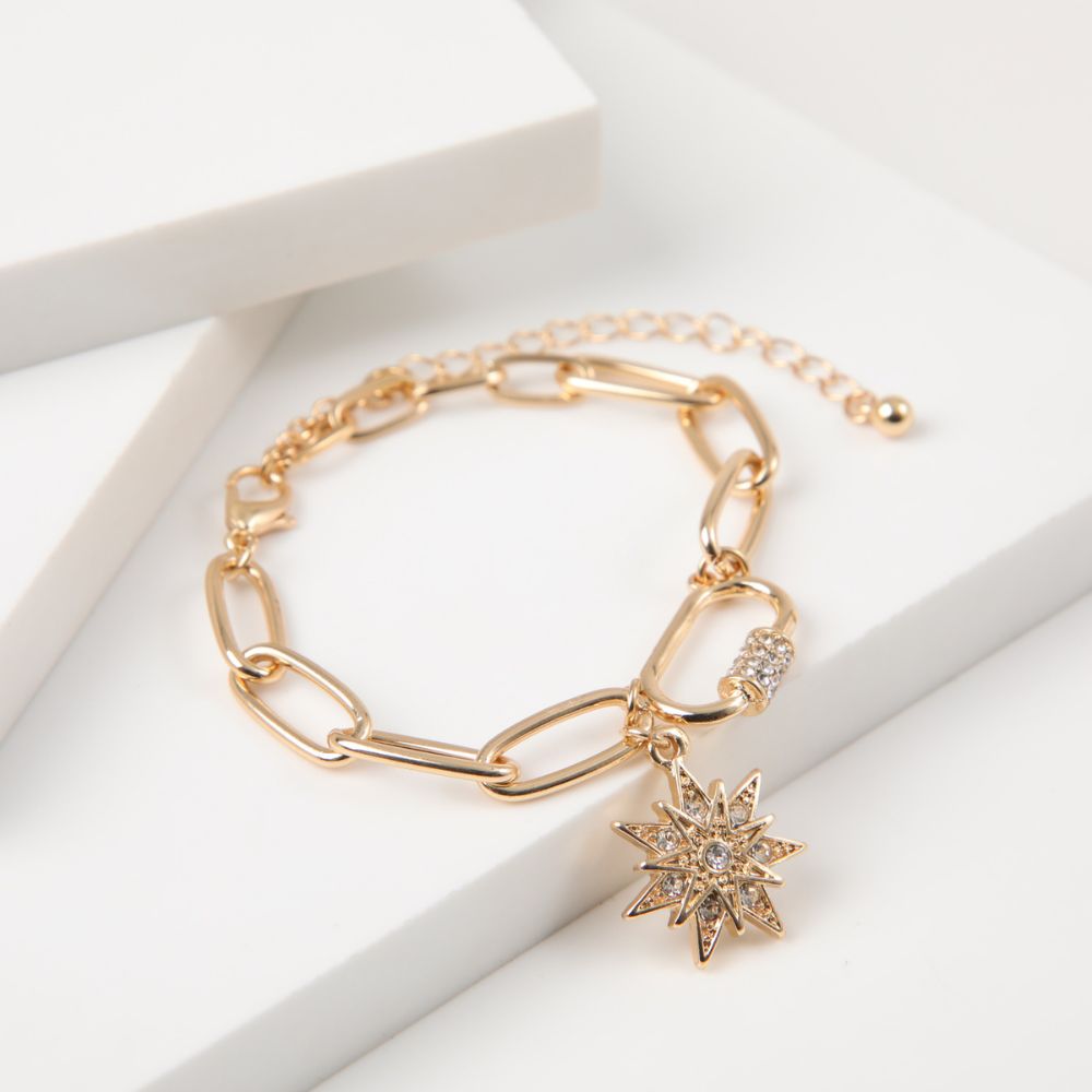 Pulsera de eslabones ovalados grandes con dije de estrella de brillantes de fantasía.
