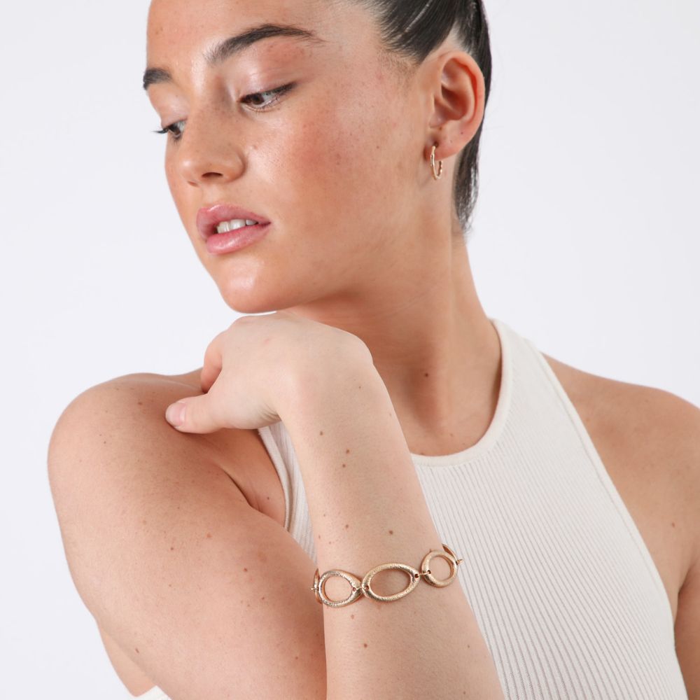 Pulsera en metal dorado. Consta de cadena compuesta por circunferencias ovaladas irregulares con textura machacada.