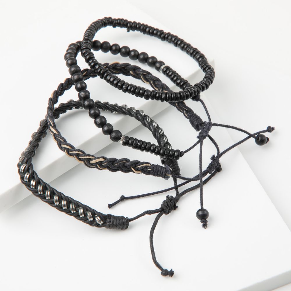 Set Pulseras Gorillaz de color negro. Este set esta compuesto por una pulsera tejida de ecocuero negro con mostacillas planas metalicas plateadas, una tejida de cuerda negra y beige y otras dos con mostacillas negras.