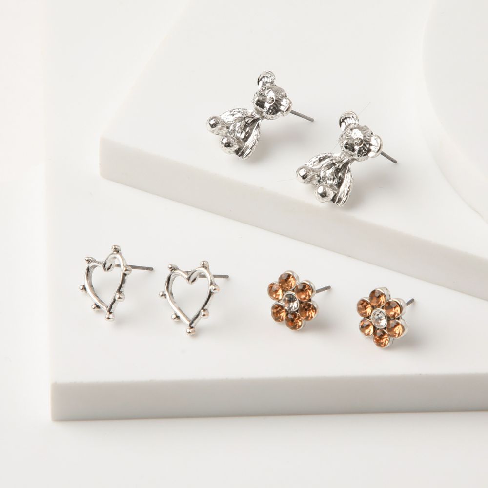 Set de tres aros pegados pequeños en metal plateado. Unos de flores con brillantes de fantasía rosados, unos de circunferencias con forma de corazón y otros de ositos.