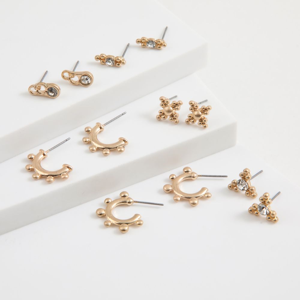 Set de seis aros pequeños en metal dorado. Cinco pegados, uno delgado de esferas y un brillante de fantasía blanco, otro tipo cruz de esferas, otro tipo argolla corta con esferas por el frente, otro de dos circunferencias unidas terminado en brillante de fantasía blanco circular y unas argollas con seis esferas de distintos tamaños por el borde frontal.