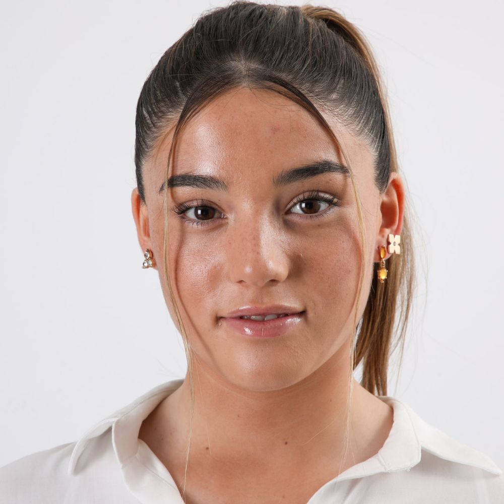 Set de seis aros pequeños en metal dorado. Tres pegados de flores abstractas con brillantes de fantasía beige, otro colgante de dos piedras de fantasía anaranjadas y dos argollas, una punteada por el frente con punta floral en la parte floral y otra de textura trenzada con dije floral con brillantes de fantasía beige.