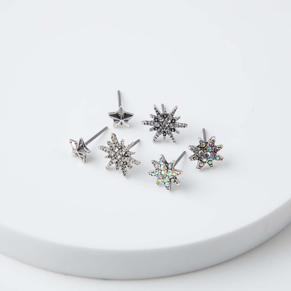 Set Aros i-D Bleu de color plateado. Este set cuenta con dos pares de aros pegados con forma de estrella, uno con cristales de fantasía transparentes y otro con cristales tornasol, y un par de aros pegados con forma de estrella con relieve.