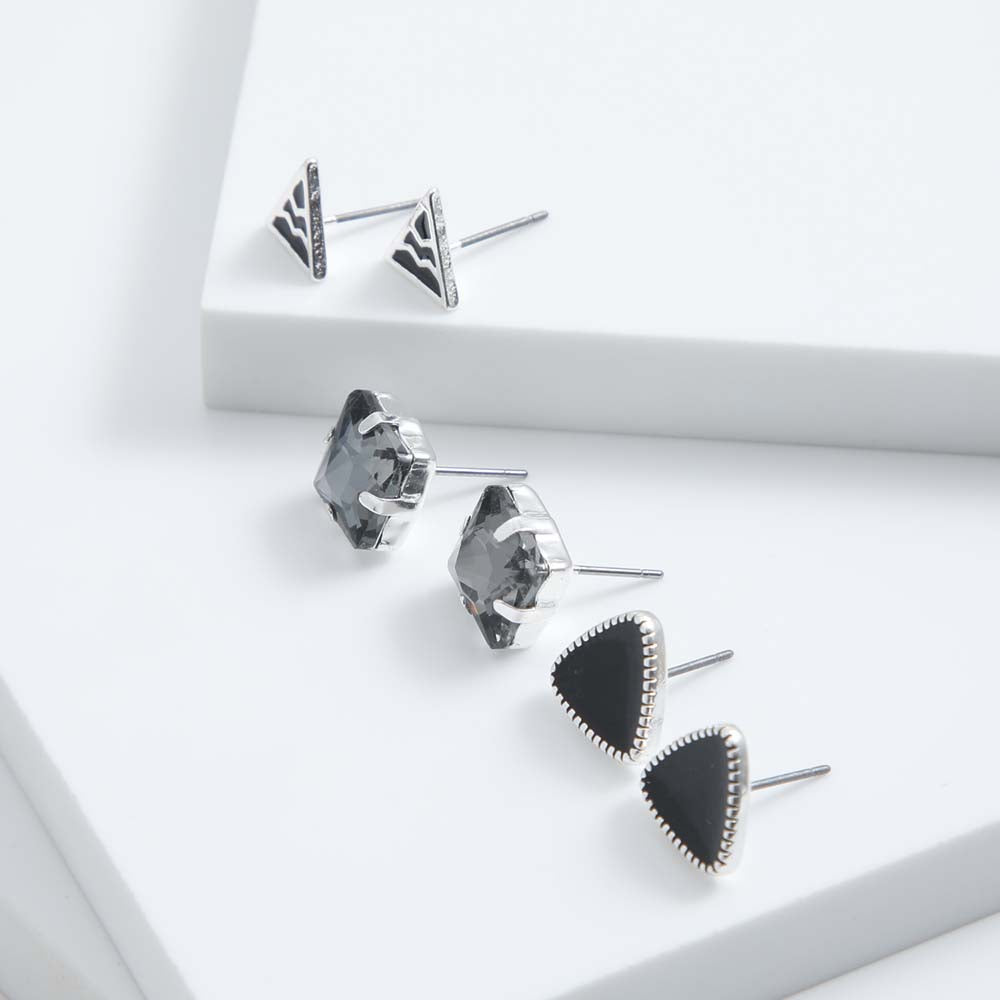 Set Aros i-D Iggy de color negro. Son tres aros pegados, dos triangulares con detalles en negro y el tercreo una piedra brillante negra transparente cuadrada.
