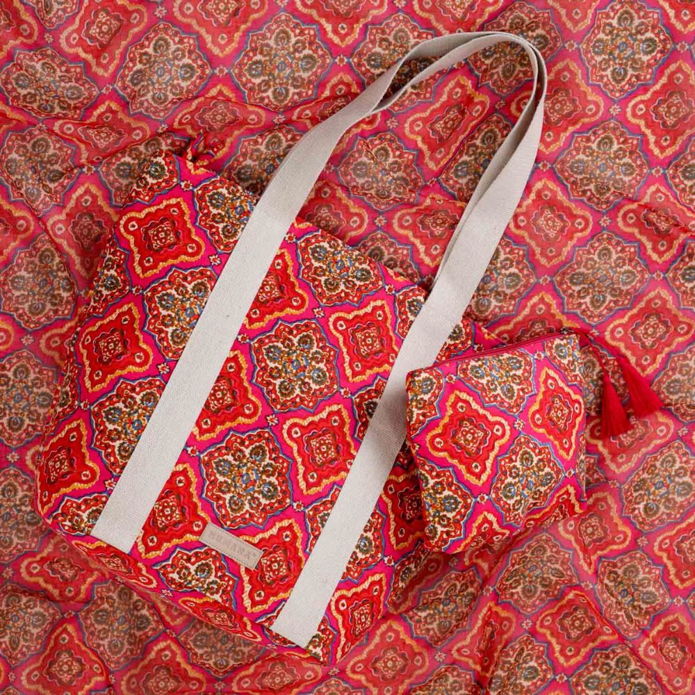 Cartera/set de playa que incluye estuche y pareo. Tiene un diseño de mandalas en tonos rosados, amarillo y toques azules y verdes. La cartera tiene dos asas para llevarla como cartera de hombro con cierre y en su interior tiene dos bolsillos abiertos.