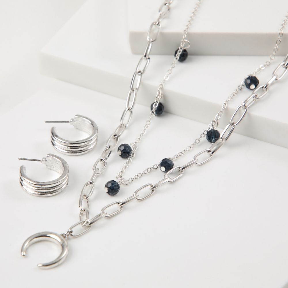 Set de collar doble de cadena pequeña con dijes de mostacillas azules, collar de cadena gruesa con dije de luna y aros de argolla multiples.
