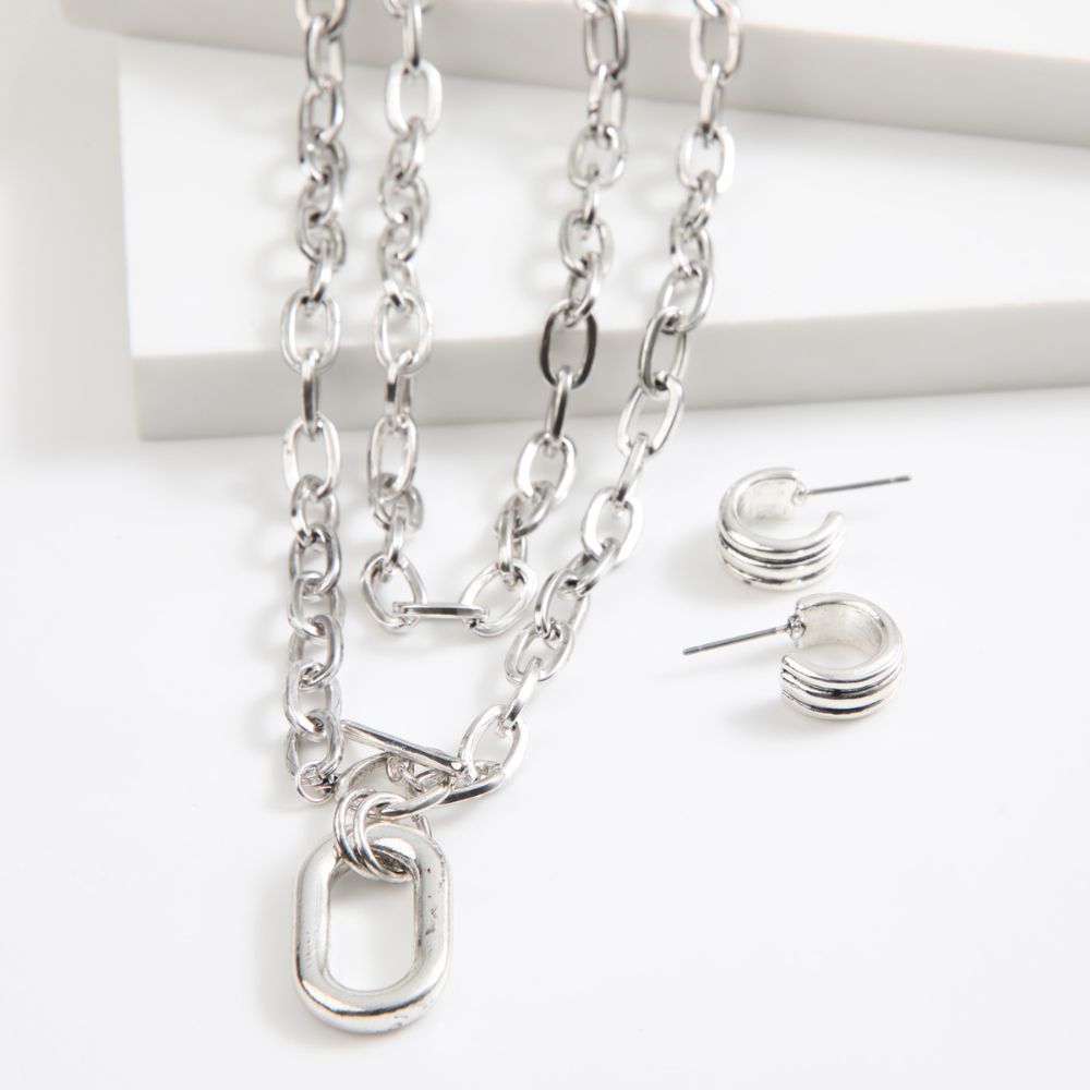 Set de aros y collar, aros tipo argolla triple y collar de cadena con dije ovalado.