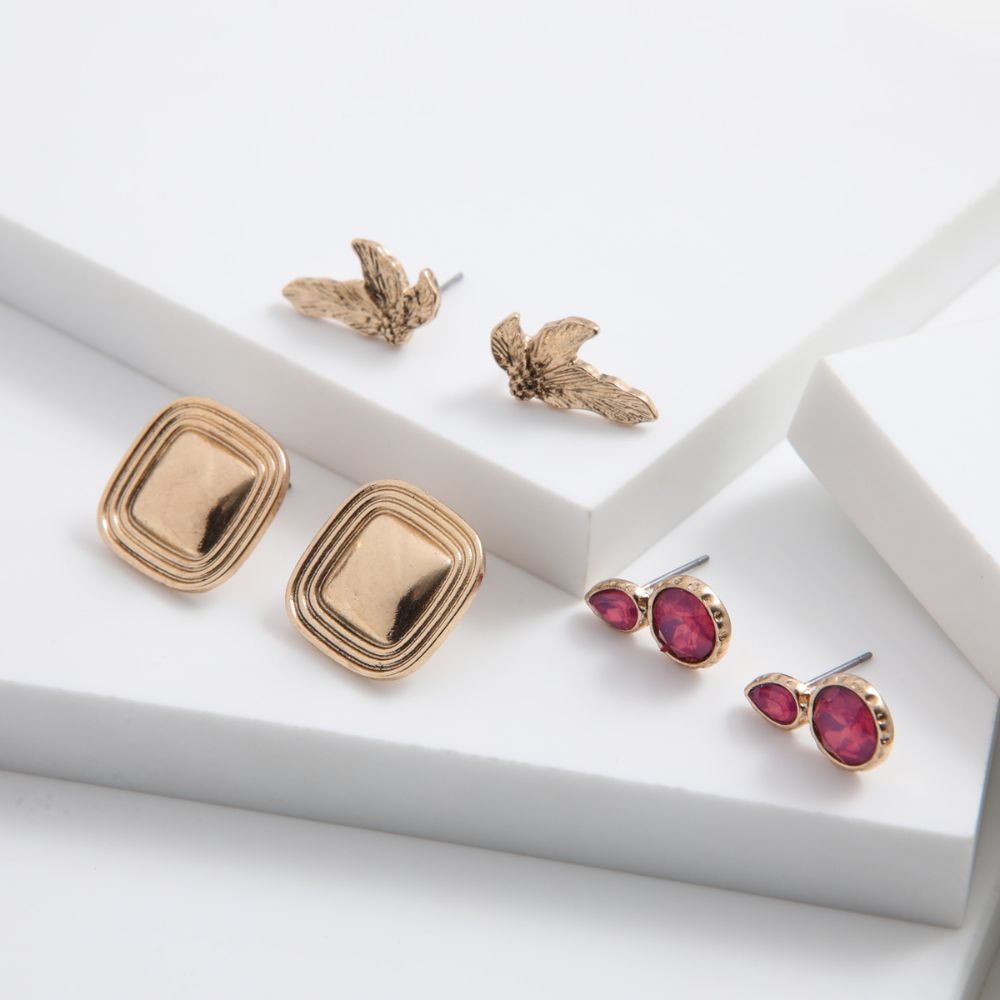 Set de tres aros pegados en metal dorado. Unos de hojas largas pequeñas, otros de dos brillantes de fantasía rosados geométricos y otros más grandes cuadrados curvos con borde de líneas.