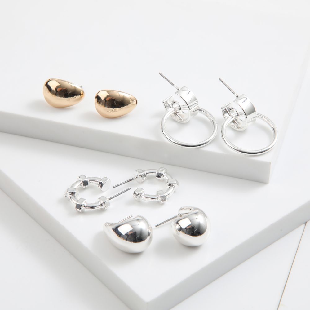 Set de cuatro aros. Unos pegados ovalados curvos en metal dorado y tres argollas en metal plateado, unas anchas tipo gota lisa, unas con cinco detalles hexagonales gruesos y otras pequeñas anchas planas con dije de circunferencia delgada.