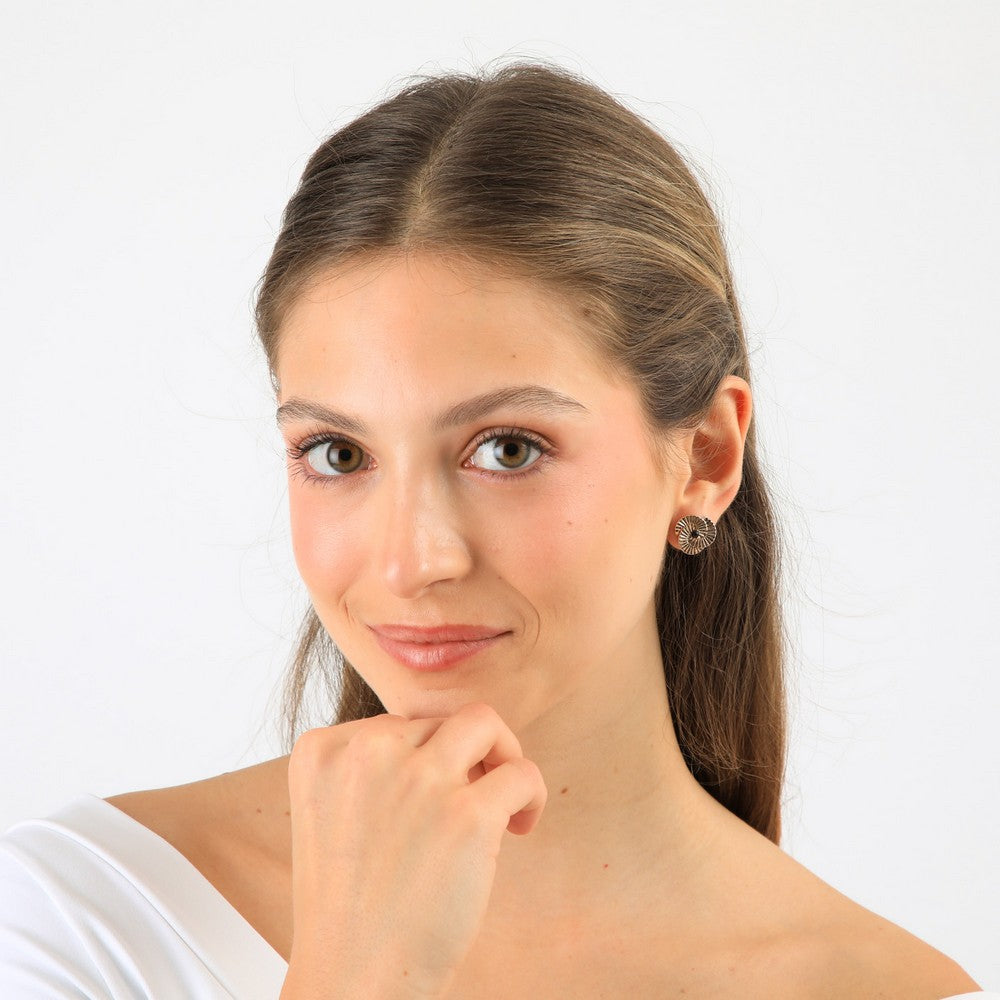 Set de aros pegados color dorado, con tres diseños: uno texturado con centro negro, otro minimalista con brillo transparente, y uno con forma de nudo metálico. Un trío versátil y moderno para el uso diario.