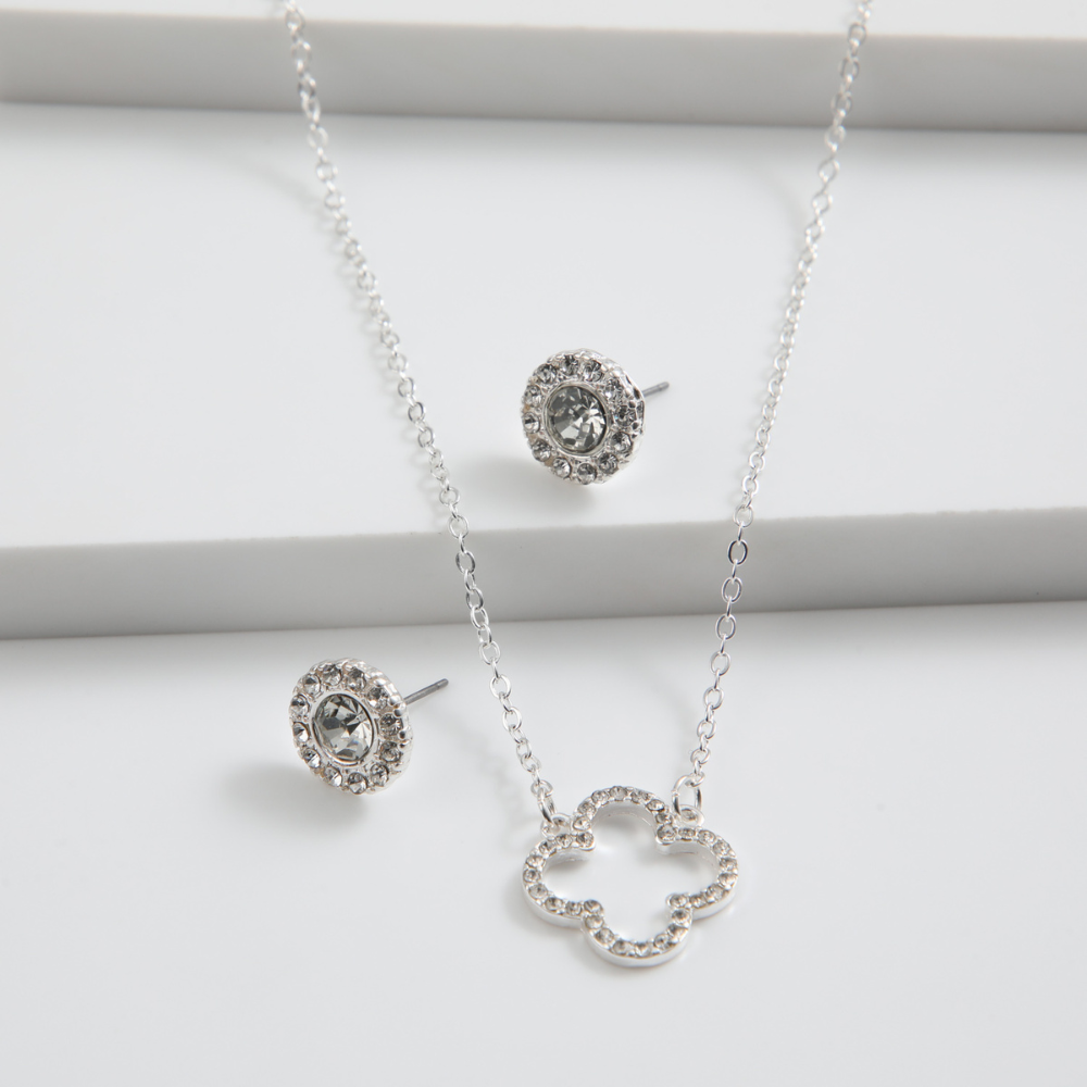 Set de aros pegados y collar corto en metal plateado. Unos aros pequeños circulares con brillantes de fantasía blancos y collar de cadena con dije de figura floral abstracta con brillantes de fantasía blancos, en el frente.