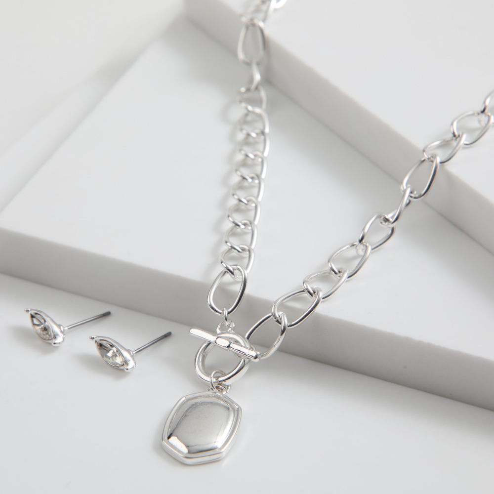 Set de aros pegados y collar corto en metal plateado. Unos aros pequeños de óvalos en punta con brillante de fantasía blanco y collar compuesto por cadena de eslabones ovalados medianos con cierre de "T" y dije de figura geométrica curva, en el frente.