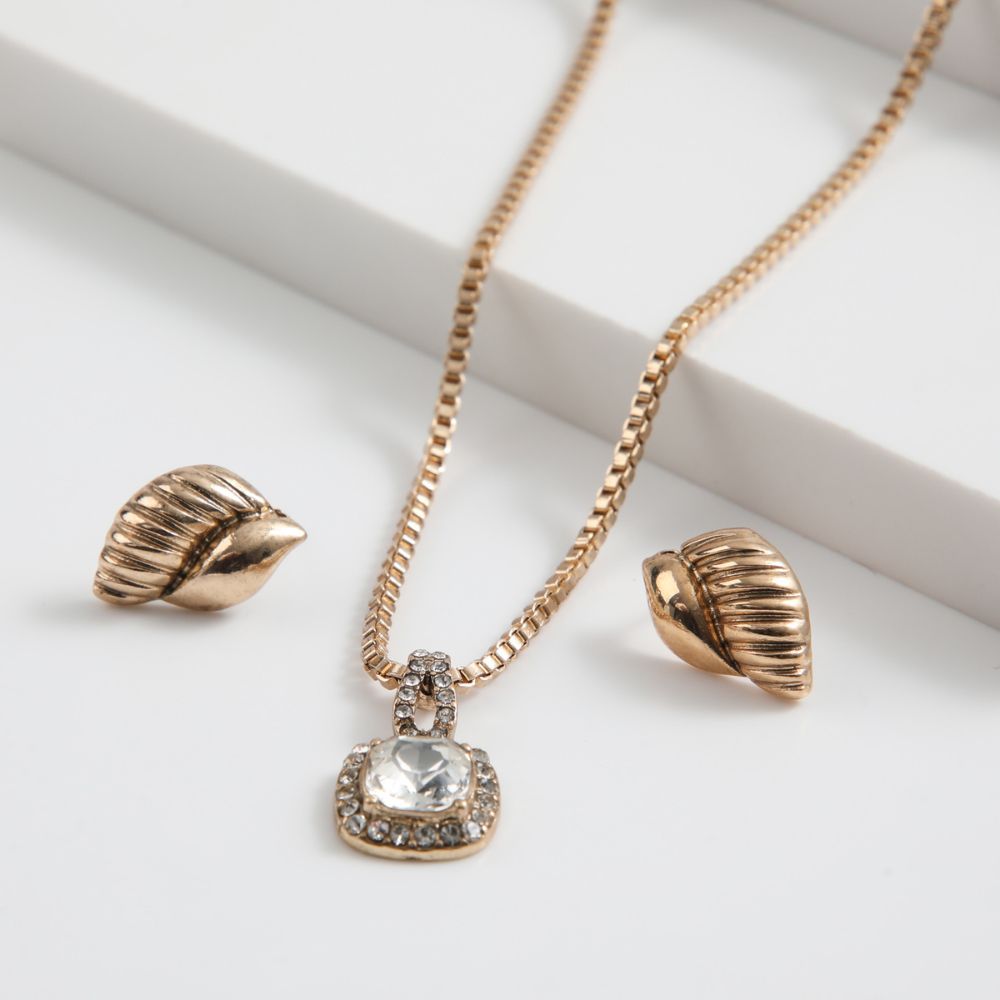 Set de aros pegados pequeños y collar corto en metal dorado. Los aros son tipo concha de mar abstracta y el collar es una cadena tubular cuadrada con dije cuadrado cubierto de brillantes de fantasía blancos y uno más grande cuadrado en el centro.