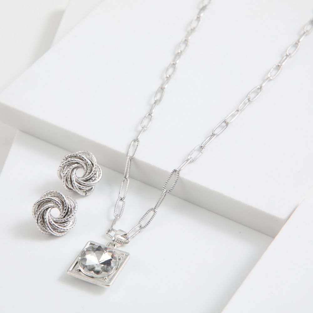 Set de aros pegados pequeños y collar corto en metal plateado. Los aros son varios tubos cruzados en posicón de circunferencia, y el collar consta de una cadena con un dije cuadrado grande con piedra de fantasía semistransparente blanca circular en el centro.