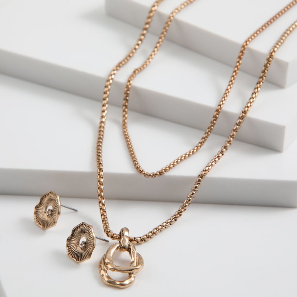 Set de aros pegados pequeños y collar en metal dorado. Los aros son de circunferencia ancha irregular orgánica con brillante de fantasía blanco pequeño y el collar consta de dos cadenas tubulares, la más larga con dije de circunferencias ovaladas irregulares de diferentes tamaños.