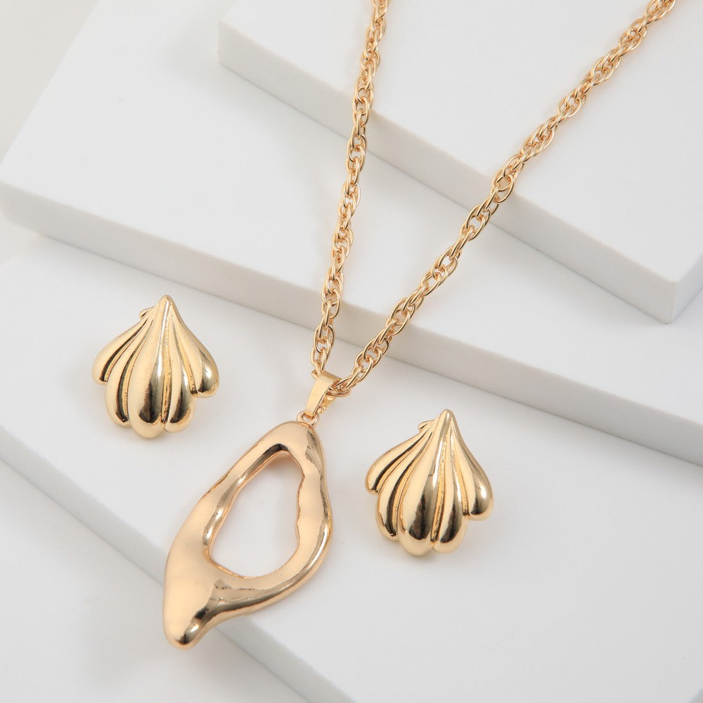 Set de collar y aros. El collar presenta una cadena fina con colgante central de forma orgánica, que aporta un look moderno y elegante. Los aros a juego repiten el diseño curvo y volumétrico, logrando un conjunto armónico y sofisticado. Un set moderno y funcional, ideal para usar junto o por separado y complementar looks de día o de noche.
