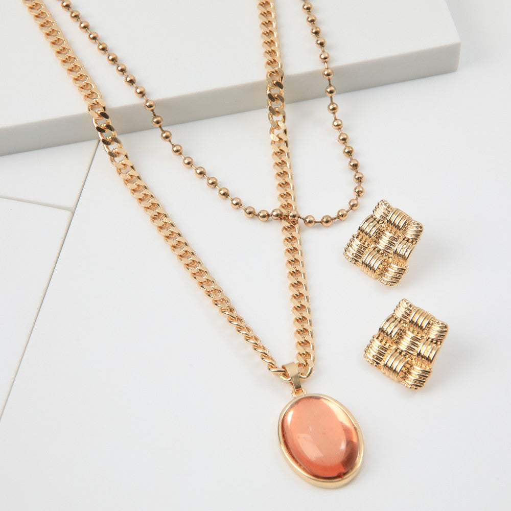 Set de collar y aros. El collar presenta diseño de doble cadena, que aporta volumen y un look moderno, con colgante ovalado central de acabado liso que suma elegancia. Los aros a juego mantienen una estética simple y sofisticada, logrando un conjunto armónico. Un set moderno y funcional, ideal para complementar looks de día o de noche.