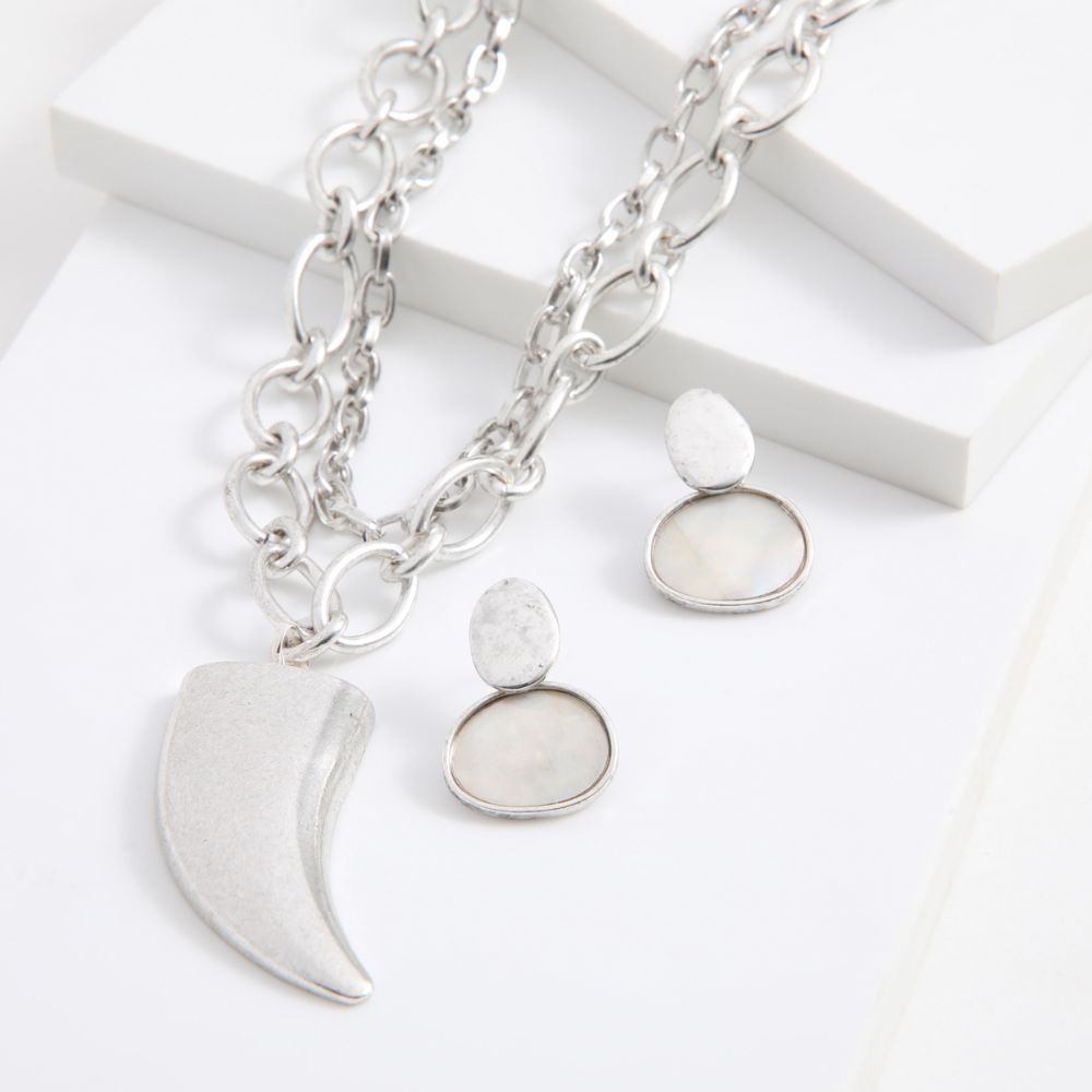 Set de aros y collar plateado. Aros pegados con dije circular de piedra blanca de fantasía. Collar tipo cadena con gran dije en forma de diente de tiburon.