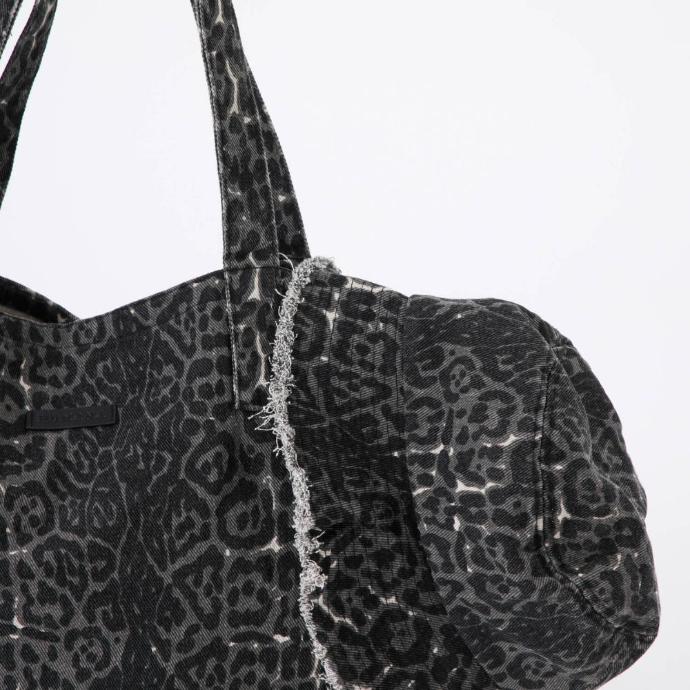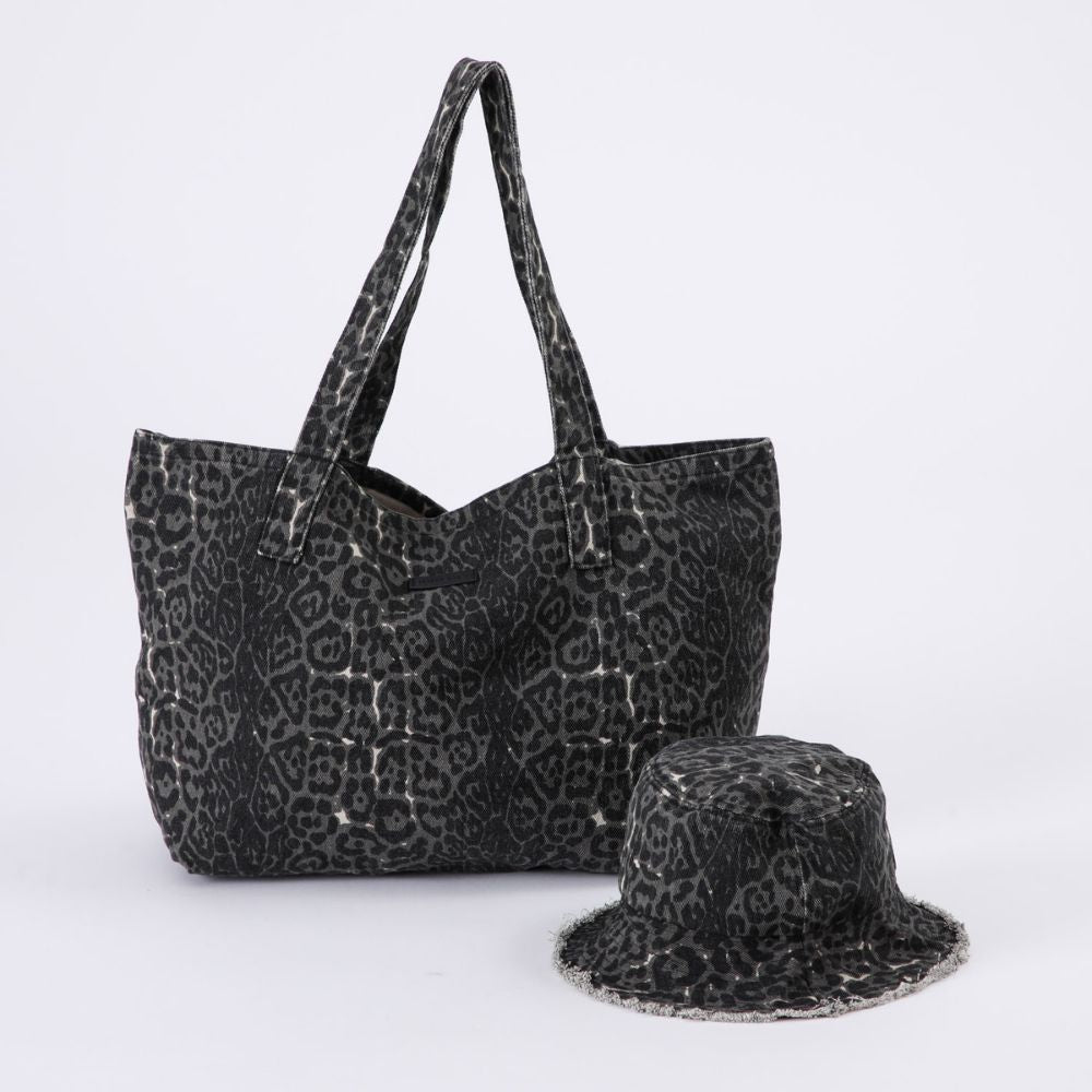 Set de cartera tipo tote y gorro tipo bucket de canvas con diseño de animal print negro con gris. La cartera tiene dos asas que permite llevarla al hombro.